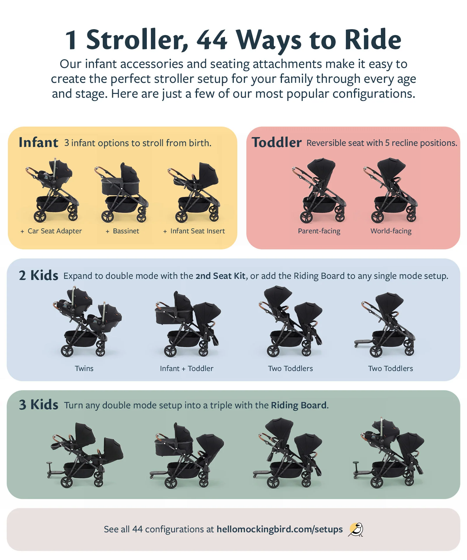 The 2nd Seat Kit lets you expand your Single-to-Double Stroller to stroll with two kiddos. It includes a second stroller seat and a set of adapters to create room for two seats.